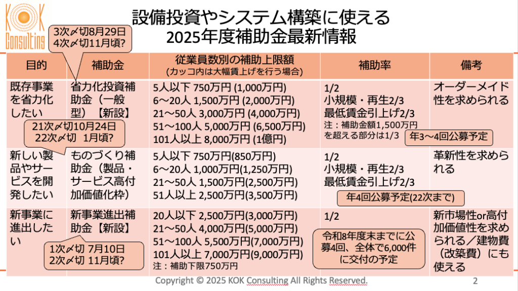 補助金申請の流れの中で注意すべき点や今年度使える省力化投資補助金/ものづくり補助金/新事業進出補助金などの概要について説明させていただきました。