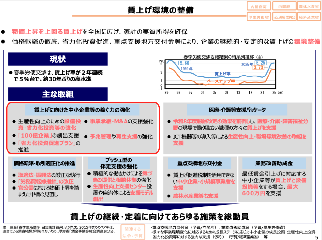 同時に公表されている「政策ファイル」の5ページ「賃上げ環境の整備」の中で、「生産性向上のための設備投資・省力化投資等の強化」「事業承継・M&Aの支援強化」「100億企業の創出支援」「省力化投資促進プランの推進」「予兆管理や再生支援の強化」などが記載されています。ここから2026年度の補助金がイメージできそうです。