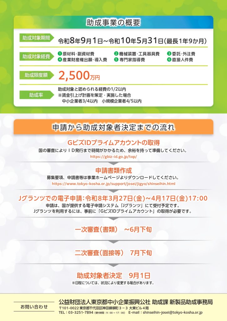 2月13日に、東京都および東京都中小企業振興公社が行う「新製品・新技術開発助成事業」の令和8年度の公募が開始されました。この事業は、都内中小企業者等の技術力の強化及び新分野の開拓を促進し、東京都産業の活性化を図るため、実用化の見込みのある新製品・新技術の研究開発に係る経費の一部を助成するものです。